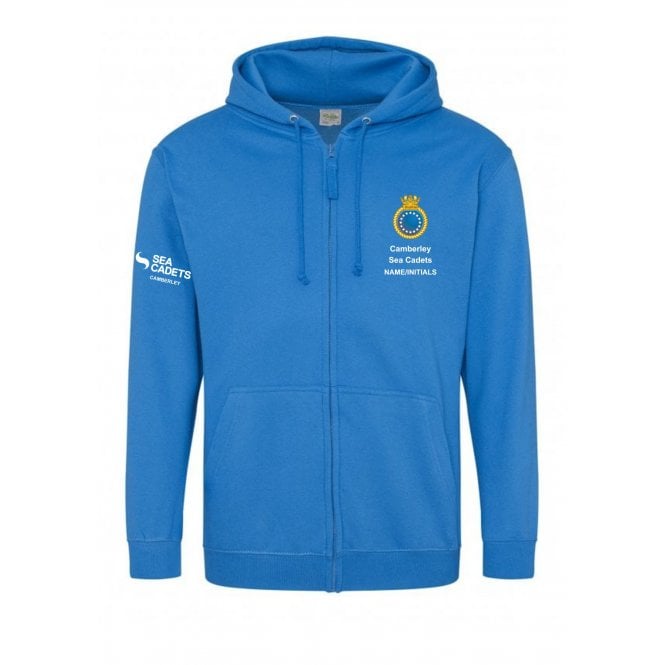 Sapphire blue zipped hoody with Camberley Sea Cadets logo embroidered on the left breast and Sea Cadets logo embroidered on the right sleeve. You have the option to add your name below the Camberley logo.