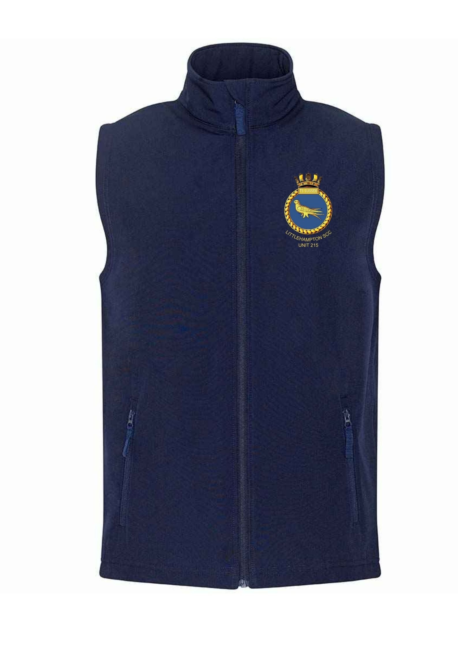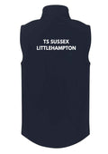 Navy 2 layer Softshell Gilet with Sussex Sea Cadets logo embroidered on the left breast and TS SUSSEX LITTLEHAMPTON printed on the back.