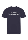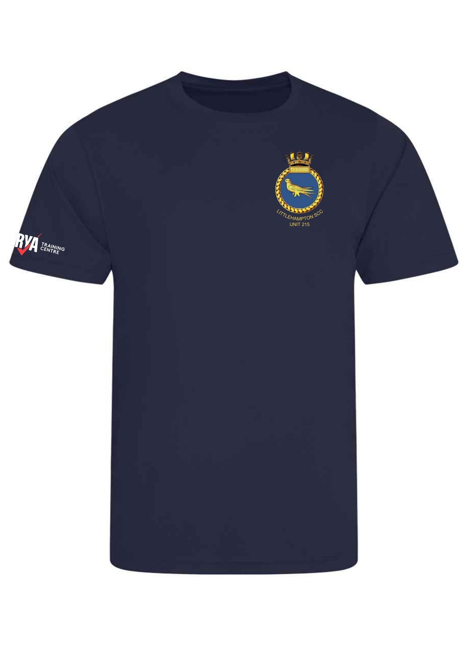 Navy sports t-shirt with Sussex Sea Cadets logo embroidered on the left breast, RYA logo on the right sleeve and TS SUSSEX LITTLEHAMPTON printed on the back. You can choose to add your name embroidered on the right sleeve under the RYA logo.