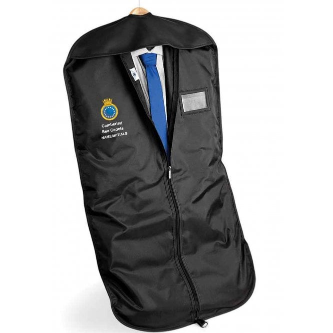 Black suit carrier with Camberley Sea Cadets logo embroidered on the right. The carrier features full length zip closure, a hanging loop for folding and an identification window. Dimensions are 100cm x 60cm. You can choose to add your name under the logo in white.